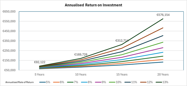 Over time, a typical €100 will not buy the same amount of goods or services that it does today. If your lump sum savings are not invested and generating at least a modest average net 2% return, inflation is slowly eating away at their real value.